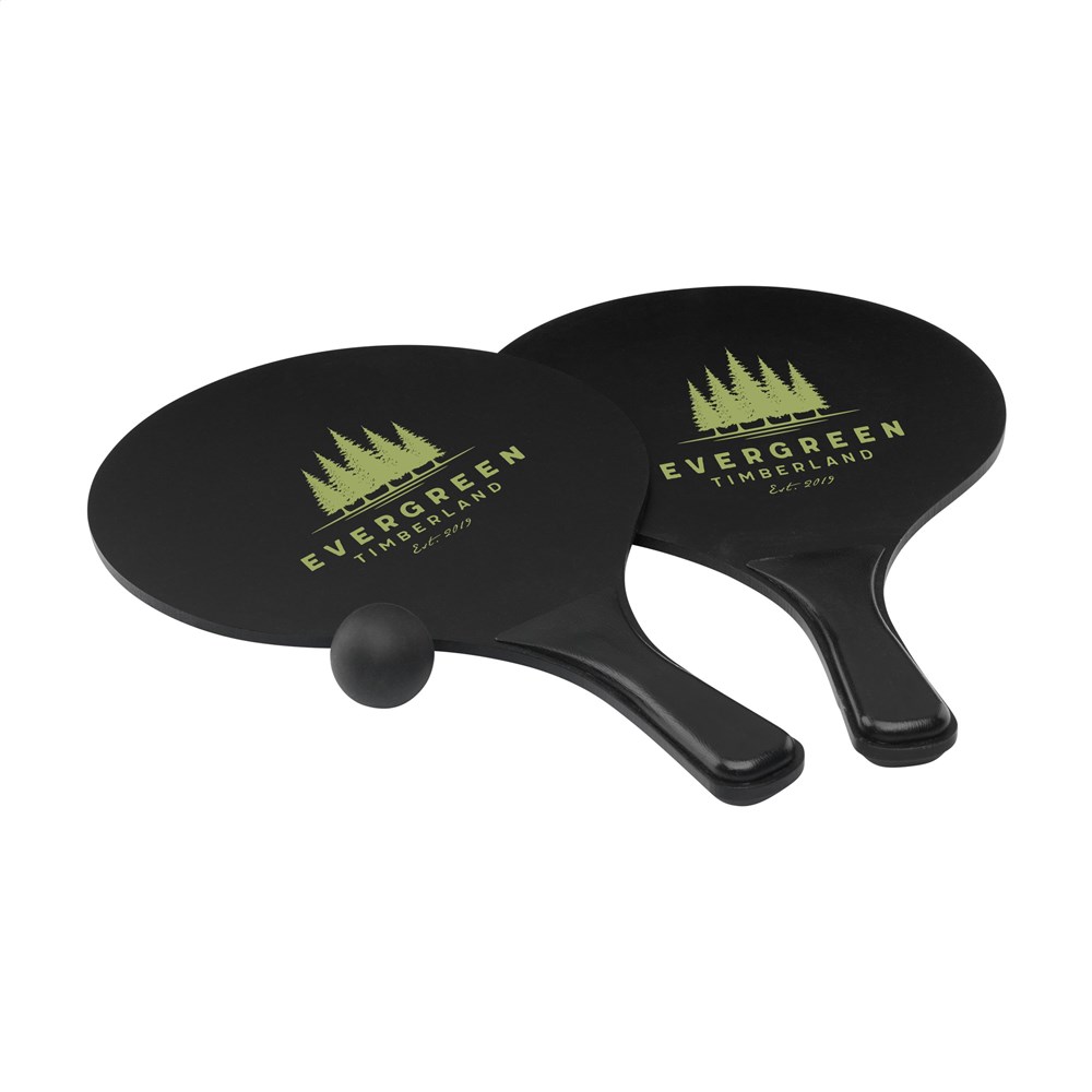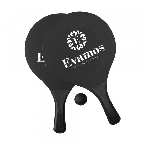 Sportliches Strandset: 2 Schläger aus MDF-Holz mit PP-Kunststoffgriffen und Gummiball. Pro Set in einem Netz zur Aufbewahrung. ACHTUNG: Bei einem 2-Farbendruck auf den Schlägern ist keine perfekte Passgenauigkeit möglich - dies ist nur gewährleistet, wenn sich die Farben nicht berühren.