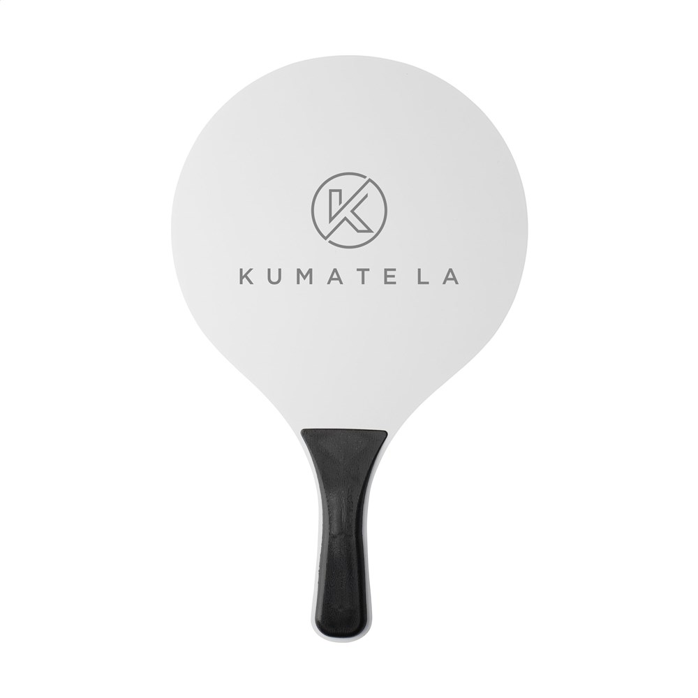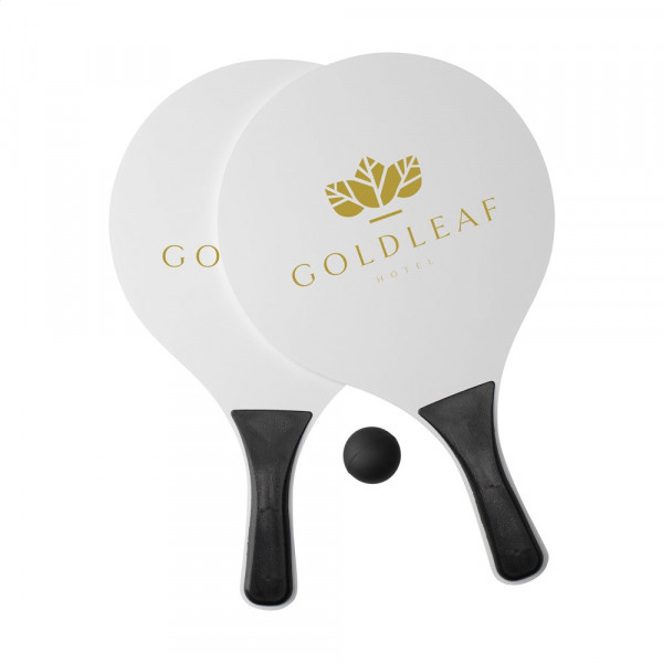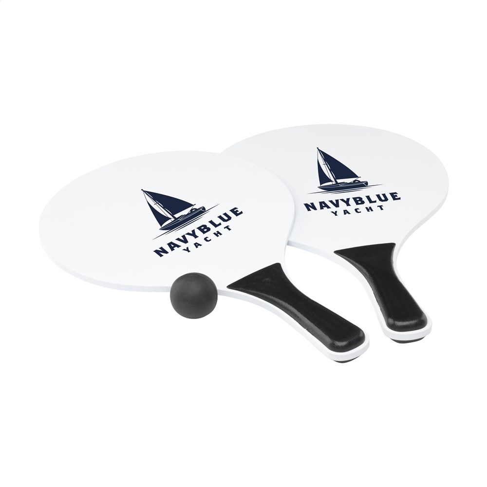 Sportliches Strandset: 2 Schläger aus MDF-Holz mit PP-Kunststoffgriffen und Gummiball. Pro Set in einem Netz zur Aufbewahrung. ACHTUNG: Bei einem 2-Farbendruck auf den Schlägern ist keine perfekte Passgenauigkeit möglich - dies ist nur gewährleistet, wenn sich die Farben nicht berühren.