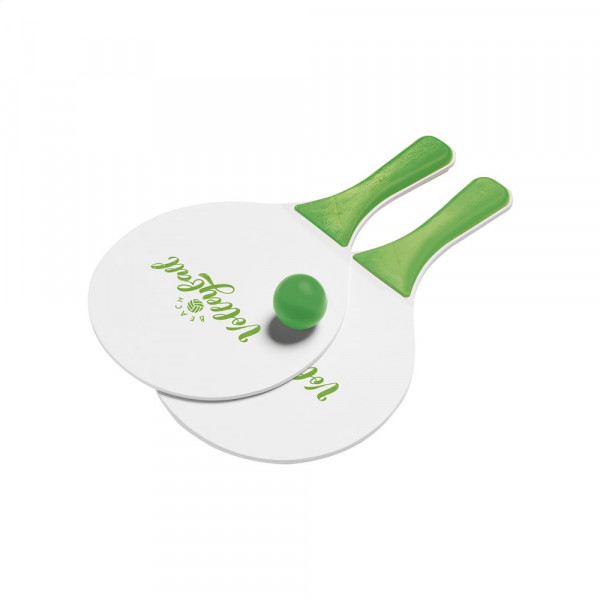 Sportliches Strandset: 2 Schläger aus MDF-Holz mit PP-Kunststoffgriffen und Gummiball. Kompakte Größe. Pro Set in einem Netz zur Aufbewahrung. ACHTUNG: Bei einem 2-Farbendruck auf den Schlägern ist keine perfekte Passgenauigkeit möglich - dies ist nur gewährleistet, wenn sich die Farben nicht berühren.