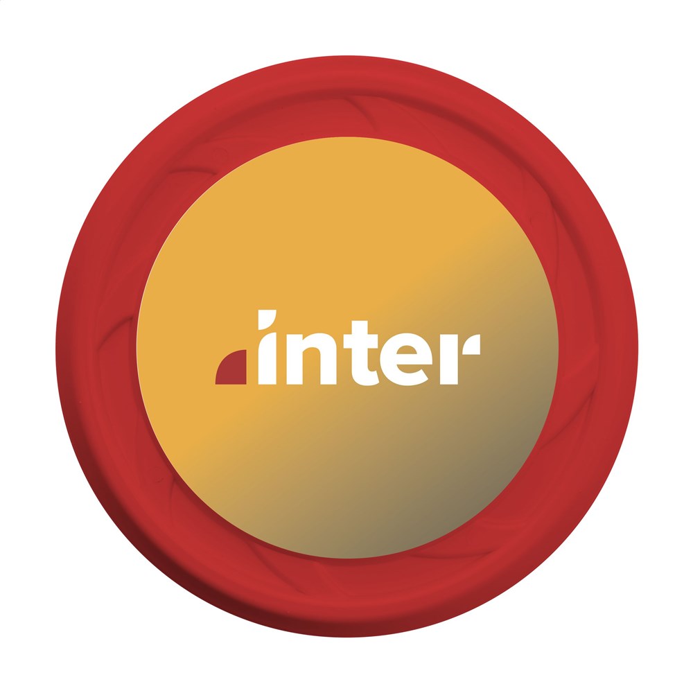 Frisbee (Ø 23 cm) aus recyceltem Kunststoff. Inklusive Vollfarb-Aufkleber.