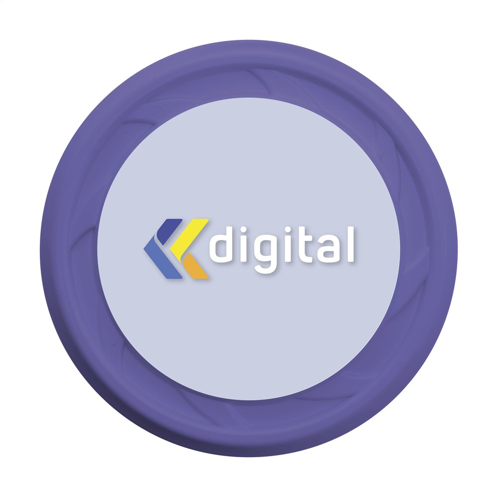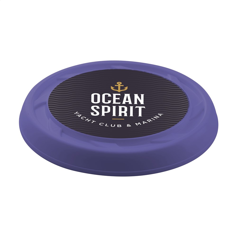 Frisbee (Ø 23 cm) aus recyceltem Kunststoff. Inklusive Vollfarb-Aufkleber.
