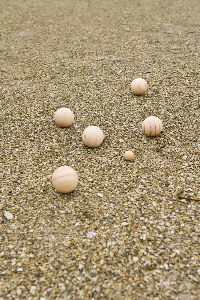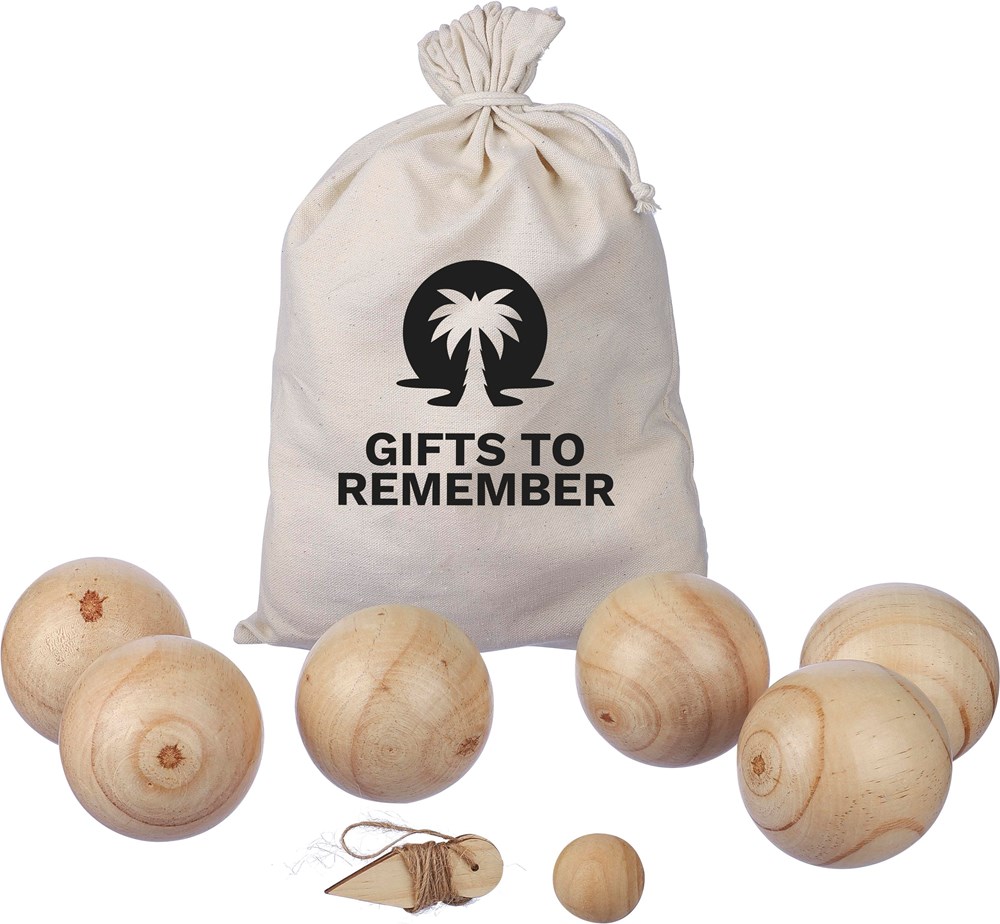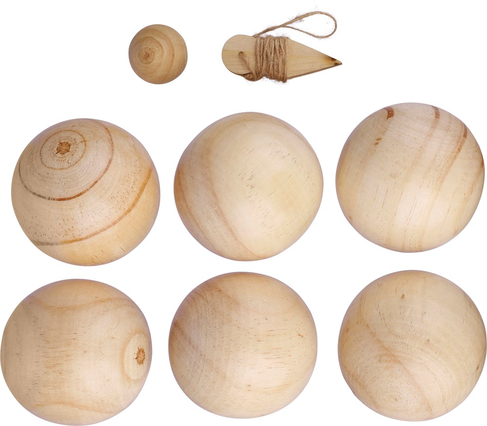 Holzkugelset bestehend aus 6 Kugeln (je 7 cm) und 1 kleineren Kugel (2 cm). Wird mit einem Seil geliefert und ist als Set in einem Baumwollbeutel mit Kordelzug verpackt. Geeignet für 4-6 Spieler und ideal für Geschicklichkeitsspiele.