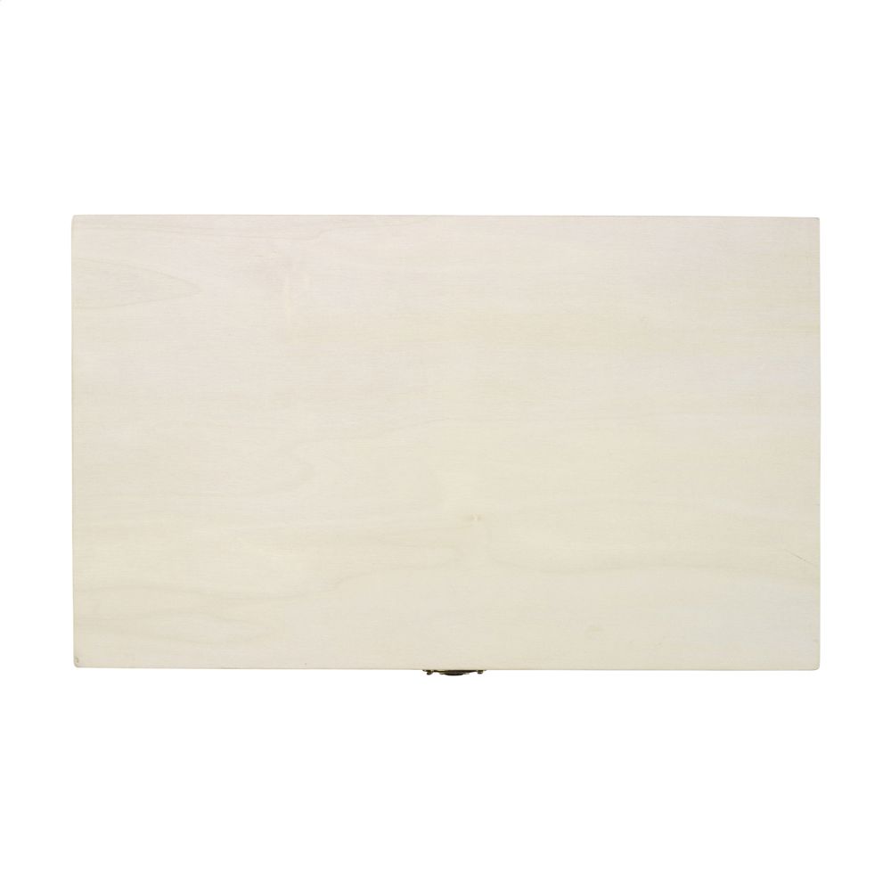 Backgammon-Spiel. Enhält Spielfiguren aus Holz und 2 Holzwürfeln. Die Schachtel, mit dem Bild des Spielbretts auf der Innenseite, ist aus 100% FSC-zertifiziertem Kiefernholz gefertigt. Inklusive Spielregeln. Verpackt pro Stück.