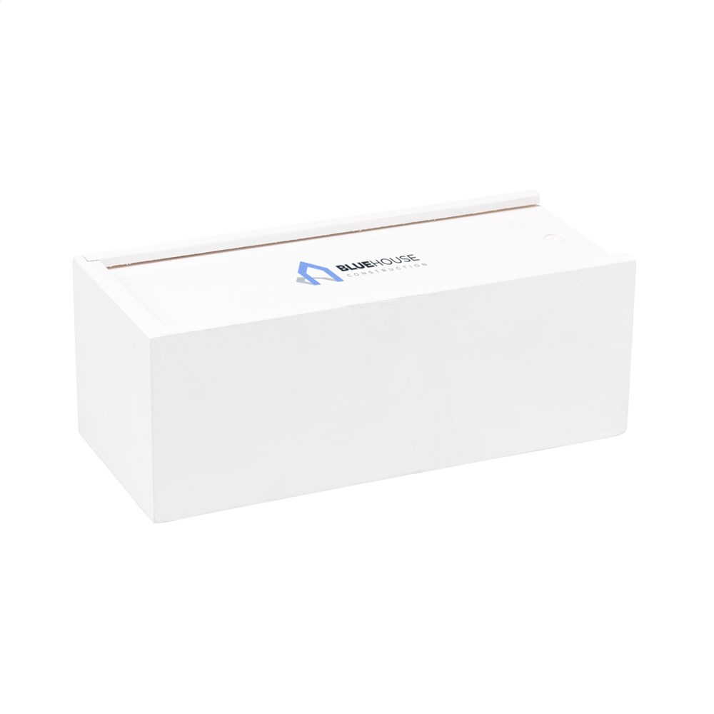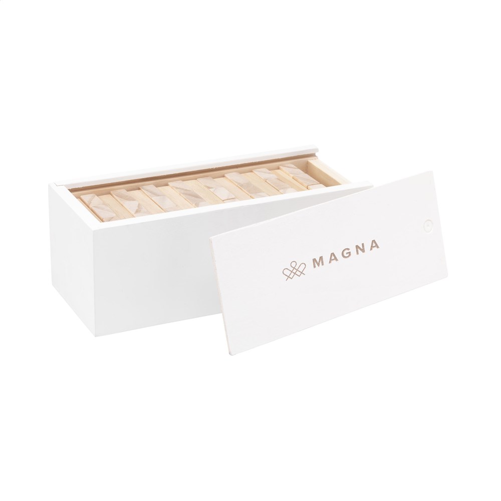 Hölzernes Stapelspiel (48 Blöcke). Abm. Turm: 16,5 x 6 x 6 cm. Die Blöcke dieses Partyspiels lassen sich leicht in der weißen Holzkiste mit Schiebeöffnung aufbewahren. Inklusive Spielanleitung. Verpackt pro Stück.