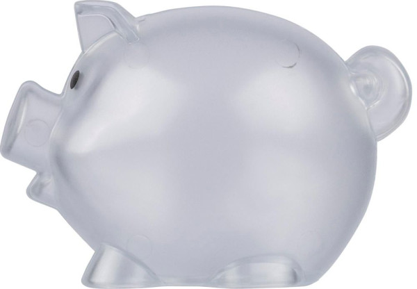 Sparschwein aus recyceltem PS-Kunststoff gefertigt. Es ist transparent und trägt auf der... mehr