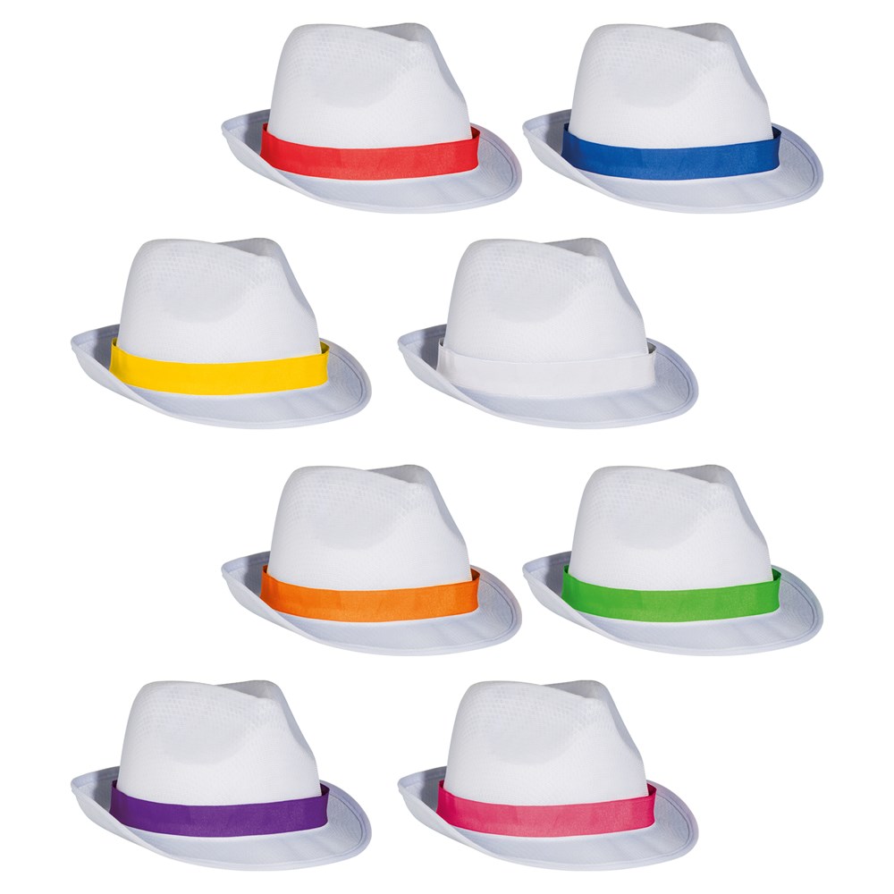 Hut aus 100% Polyester mit farbigem Band. Wir drucken Ihre Werbung an eine Position auf das Hutband. Bitte beachten Sie, dass bei neutraler Ware das Band nicht zusammengenäht und extra geliefert wird. Hutbänder werden auch bei bedruckter Ware lose angeliefert. Annähen des Bandes auf Anfrage möglich.