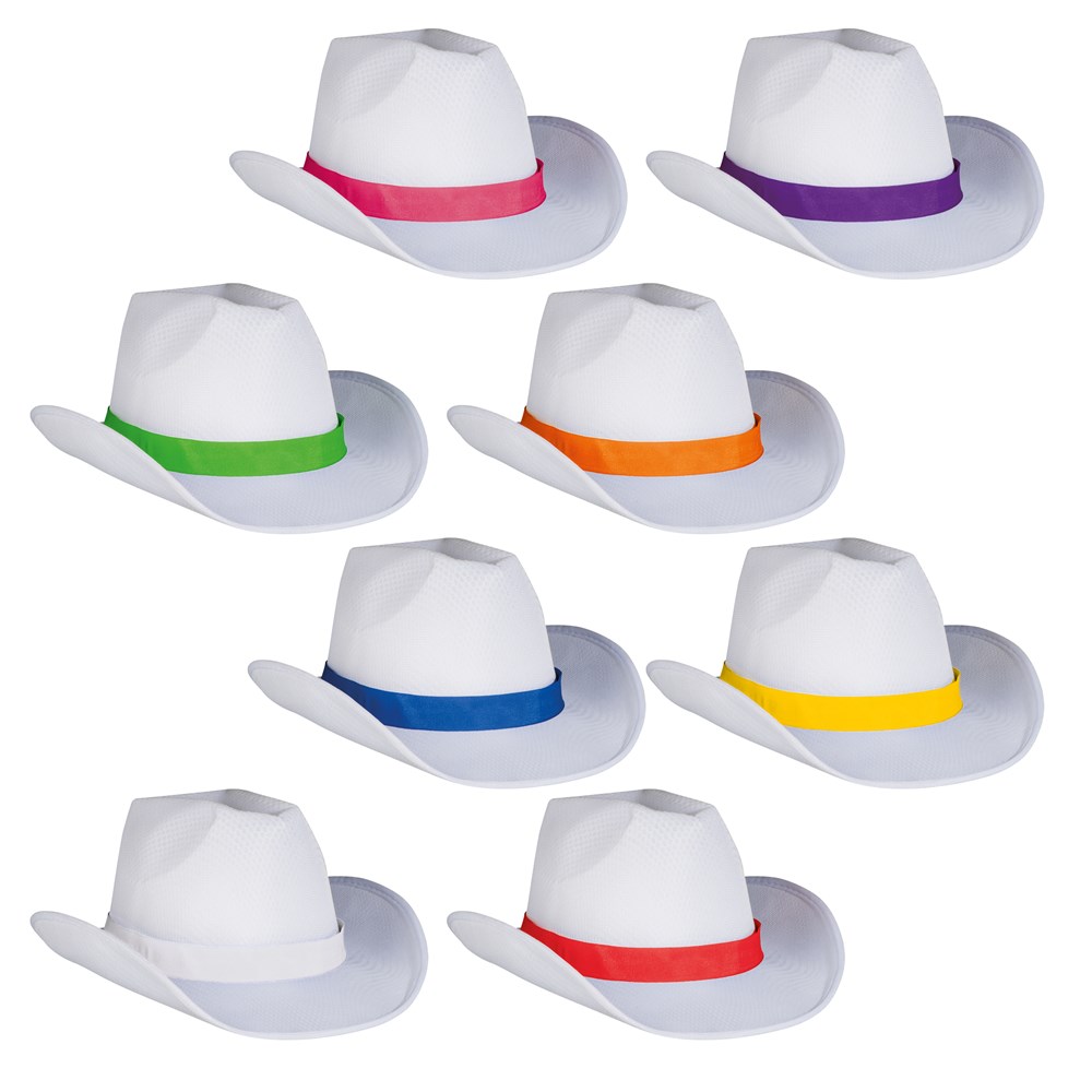 Hut aus 100% Polyester mit farbigem Band. Wir drucken Ihre Werbung an eine Position auf das Hutband. Bitte beachten Sie, dass bei neutraler Ware das Band nicht zusammengenäht und extra geliefert wird. Hutbänder werden auch bei bedruckter Ware lose angeliefert. Annähen des Bandes auf Anfrage möglich.