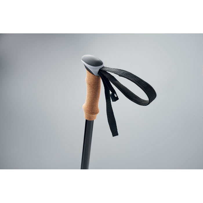 Wanderstöcke aus Aluminium mit Griffen aus Kork, Gummispitzen und Schlammteller. Lieferung in RPET-Ripstop-Tasche. Einstellbare Länge: 65cm bis 135cm.