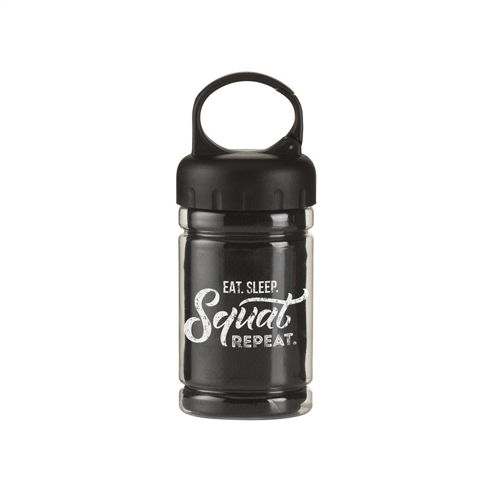 Spezielles Kühlhandtuch aus 100 % Polyester. Nach dem Eintauchen in kaltes Wasser kann dieses Handtuch bei sportlichen Aktivitäten oder Sonnenbrand kühlen. Maße 30 x 80 cm. Ideales Format, um es zur Kühlung im Nacken zu tragen. In transparentem Gehäuse mit ABS-Schraubverschluss mit Karabinerhaken.