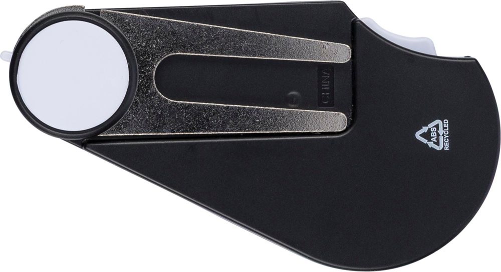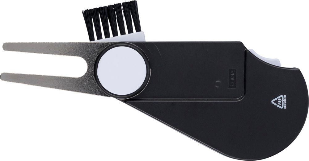 Multifunktionales Golf-Tool aus recyceltem ABS mit integriertem Marker, Pitchgabel, Reinigungsbürste und Punktezähler. Mit Recycling-ABS-Logo auf der Rückseite. Verpackt in einem recycelten Polybeutel.