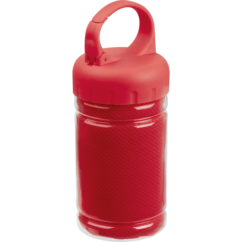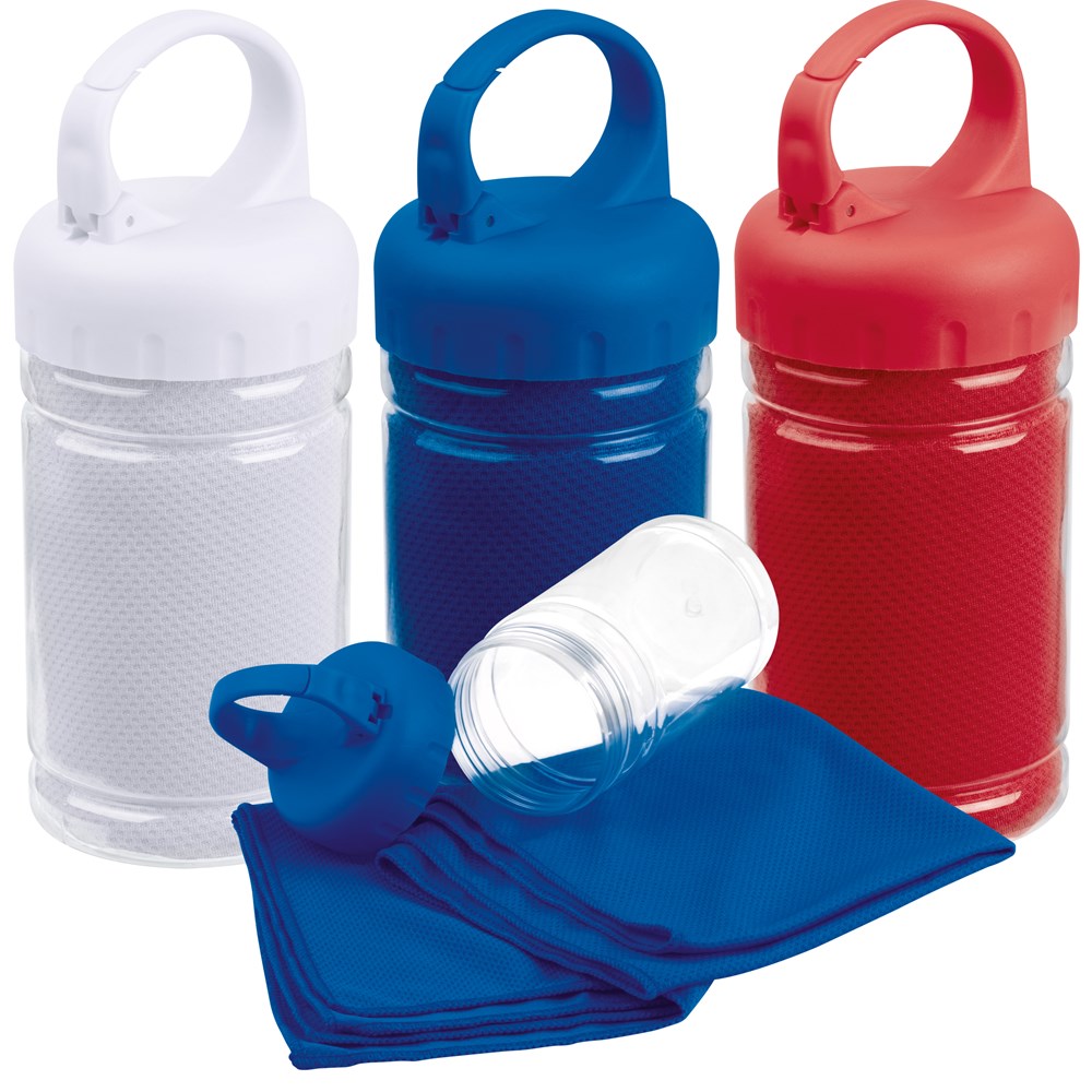Toller Begleiter beim Sport, ständig gekühltes Handtuch (Polyester, Grammatur 160gsm) durch Kapillareffekt, verpackt in einer Kunststoffflasche mit Karabiner. Ihre Werbung drucken wir auf die Flasche.