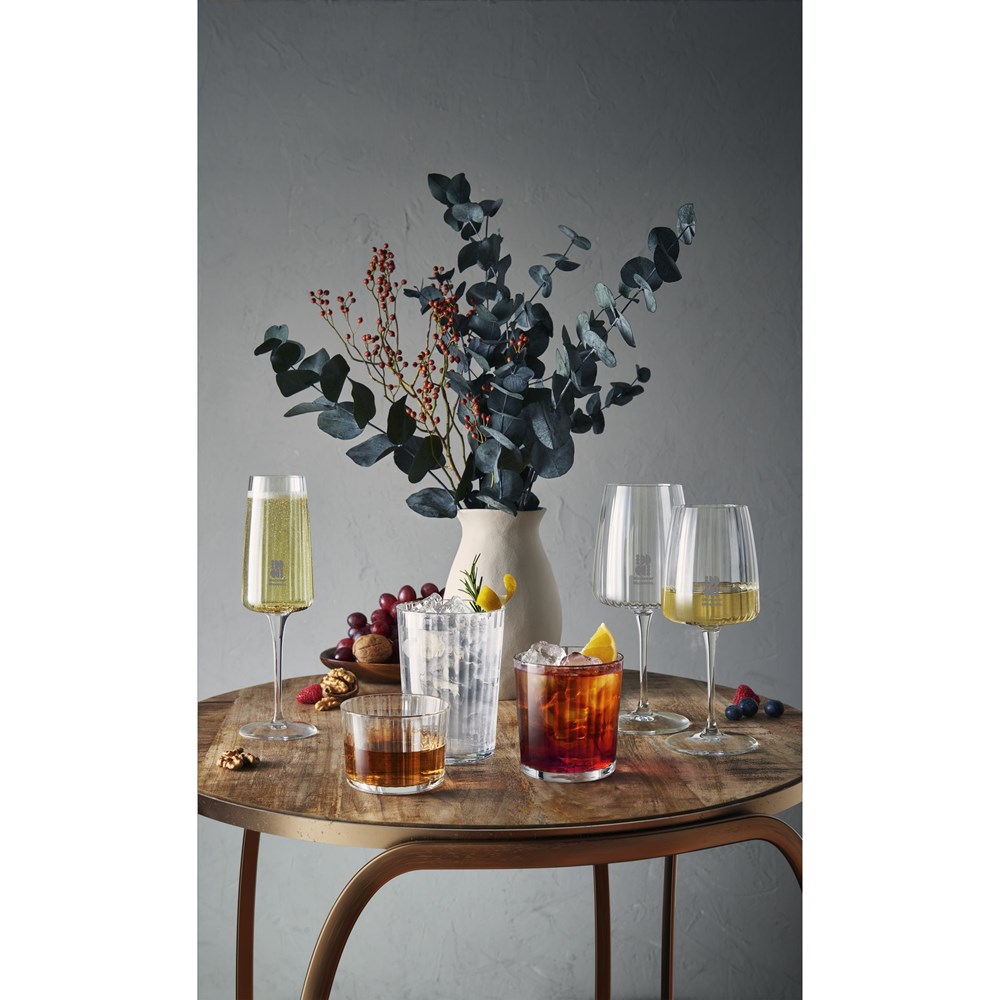 einglas aus klarem Glas. Der besondere Kelch zeichnet sich durch geriffeltes Glas an der Innenseite, eine glatte Außenseite und flachen Kelkboden aus, was dem Glas ein elegantes, besonderes Aussehen verleiht. Dieses exklusive Weinglas eignet sich zum Servieren von Rotwein. Es überzeugt sowohl im privaten Bereich als auch in der Gastronomie. Spülmaschinenfest. Fassungsvermögen 535 ml. Hergestellt in Europa.