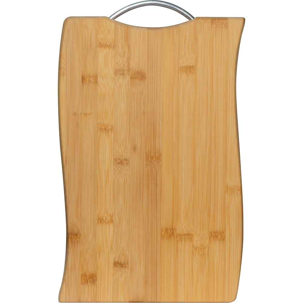 Schneidebrett aus Bambus mit integriertem Metall Tragehenkel. Ihre Werbung bringen wir mittels einer Lasergravur auf dem Brett an.