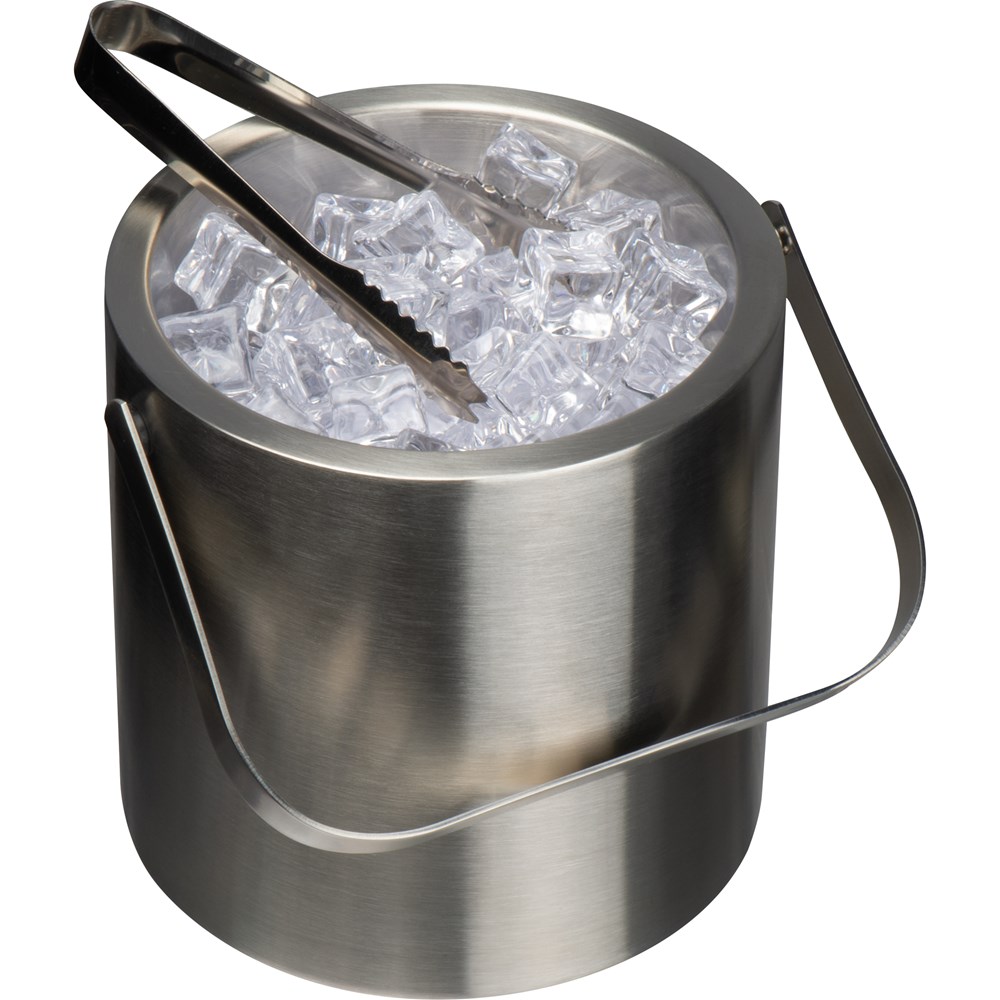 Doppelwandiger Eiskübel aus Edelstahl mit Tragehenkel, Bambusdeckel, Greifzange und einem Füllvermögen von 1.200 ml. Ihre Werbung wird auf den Kübel graviert.