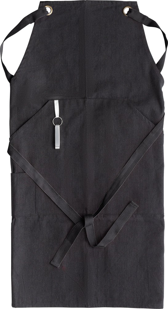 Schürze aus Polyester und Baumwolle mit farbigen Bändern und Fronttasche. Inklusive Flaschenöffner.