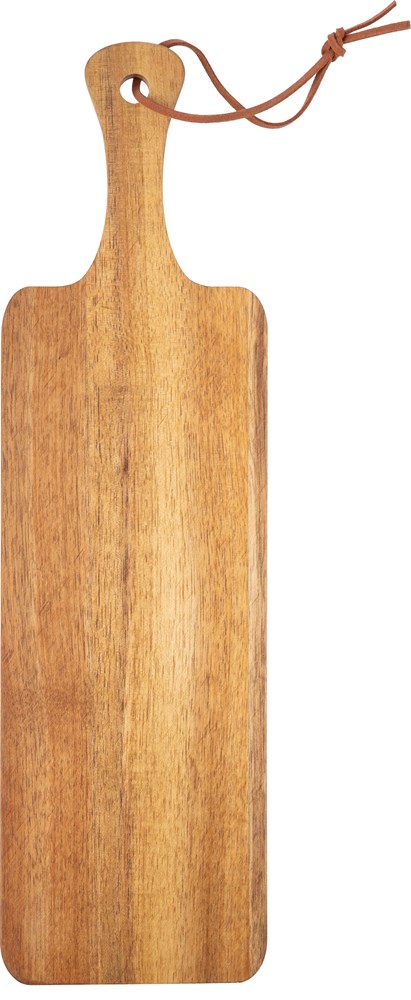 Schneidebrett aus Akazienholz mit Griff und PU-Schnur. Einzeln verpackt in einem braunen Karton. mehr