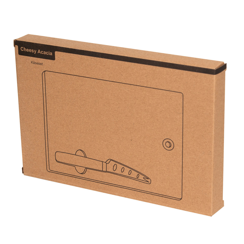 Käseset CHEESY ACACIA: bestehend aus 1 Schneidebrett aus Akazienholz und 1 Käsemesser mit Akazienholzgriff und Edelstahlklinge, Messer lässt sich perfekt in Vertiefung mit Magnet verstauen, mit Edelstahl verstärktes Loch zum Aufhängen, in Box