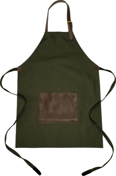 Leinenschürze (450 g/m2) mit rPET-PU-Tasche und verstellbarem Nackenband. Wasserabweisend.
