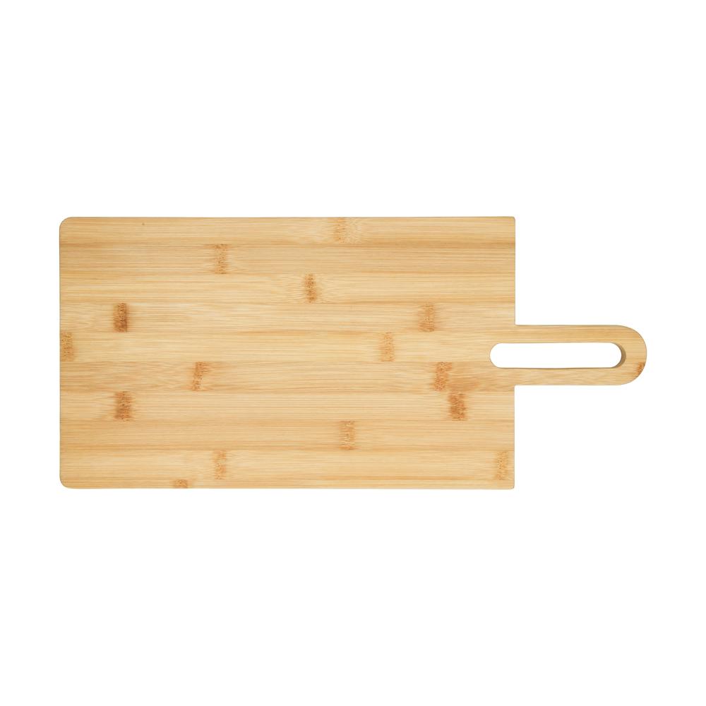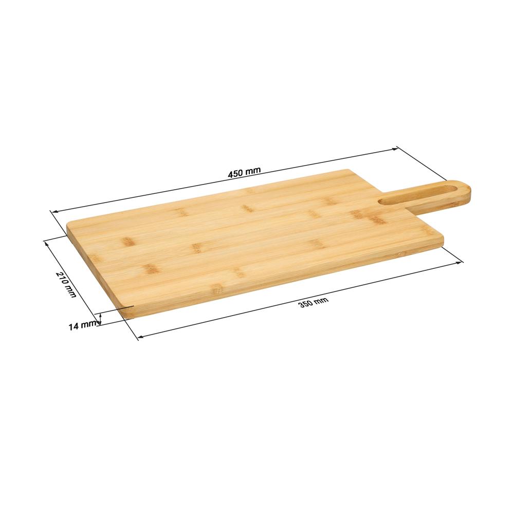 Das Schneidbrett in Form eines Paddels aus Bambus ist mit Sojabohnenöl veredelt, wodurch es äußerst robust und ideal für alle Lebensmittel geeignet ist. Das 12 mm starke Hartholzbrett mit elegantem Griff und Griffloch macht auch als Servierplatte eine gute Figur und lässt sich gut und platzsparend aufbewahren. Größe: 45 x 21 cm