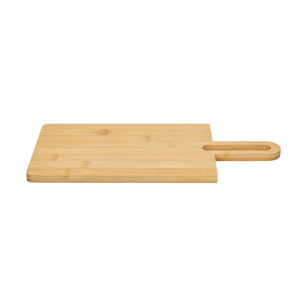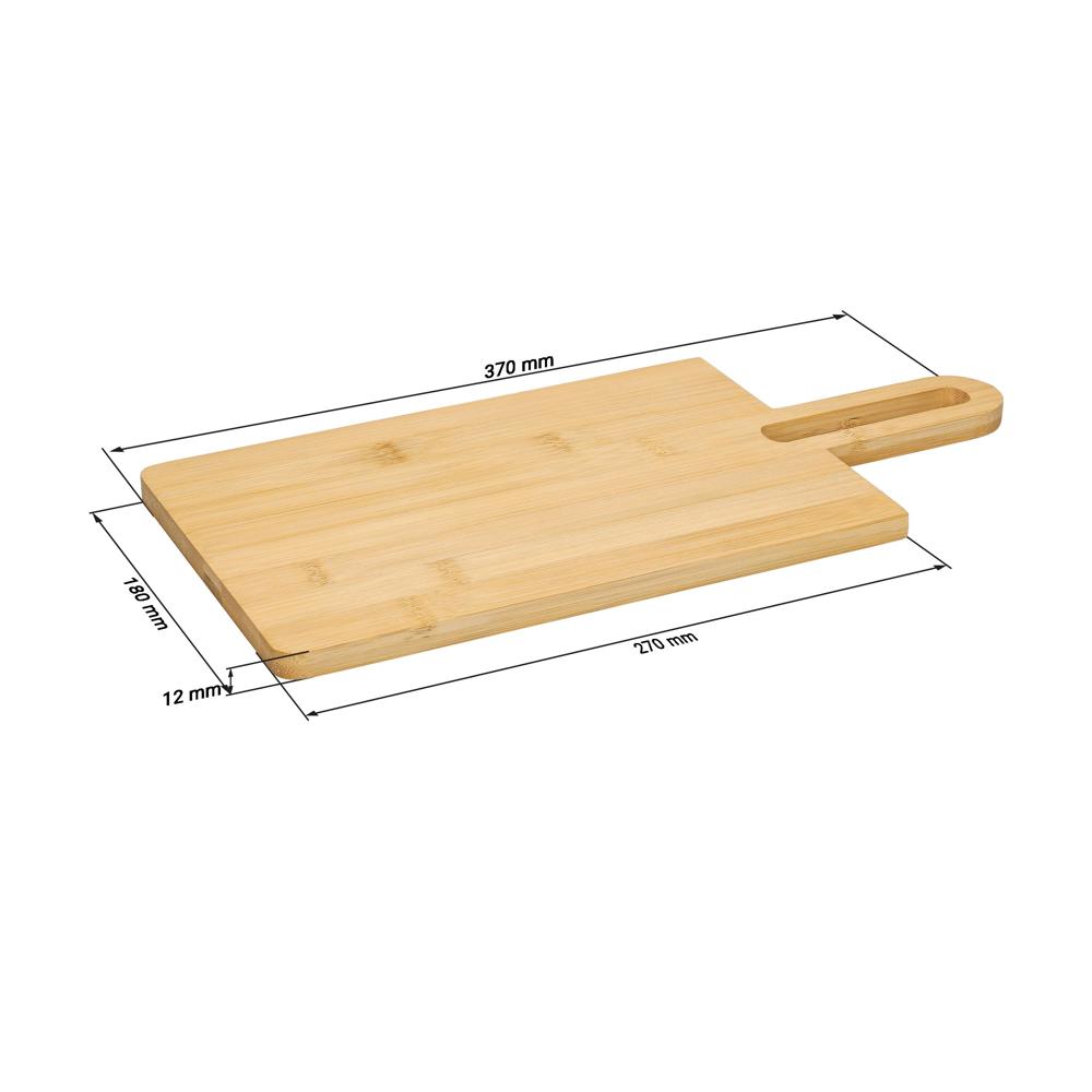 Das Schneidbrett in Form eines Paddels aus Bambus ist mit Sojabohnenöl veredelt, wodurch es äußerst robust und ideal für alle Lebensmittel geeignet ist. Das 12 mm starke Hartholzbrett mit elegantem Griff und Griffloch macht auch als Servierplatte eine gute Figur und lässt sich gut und platzsparend aufbewahren. Größe: 37 x 18 cm