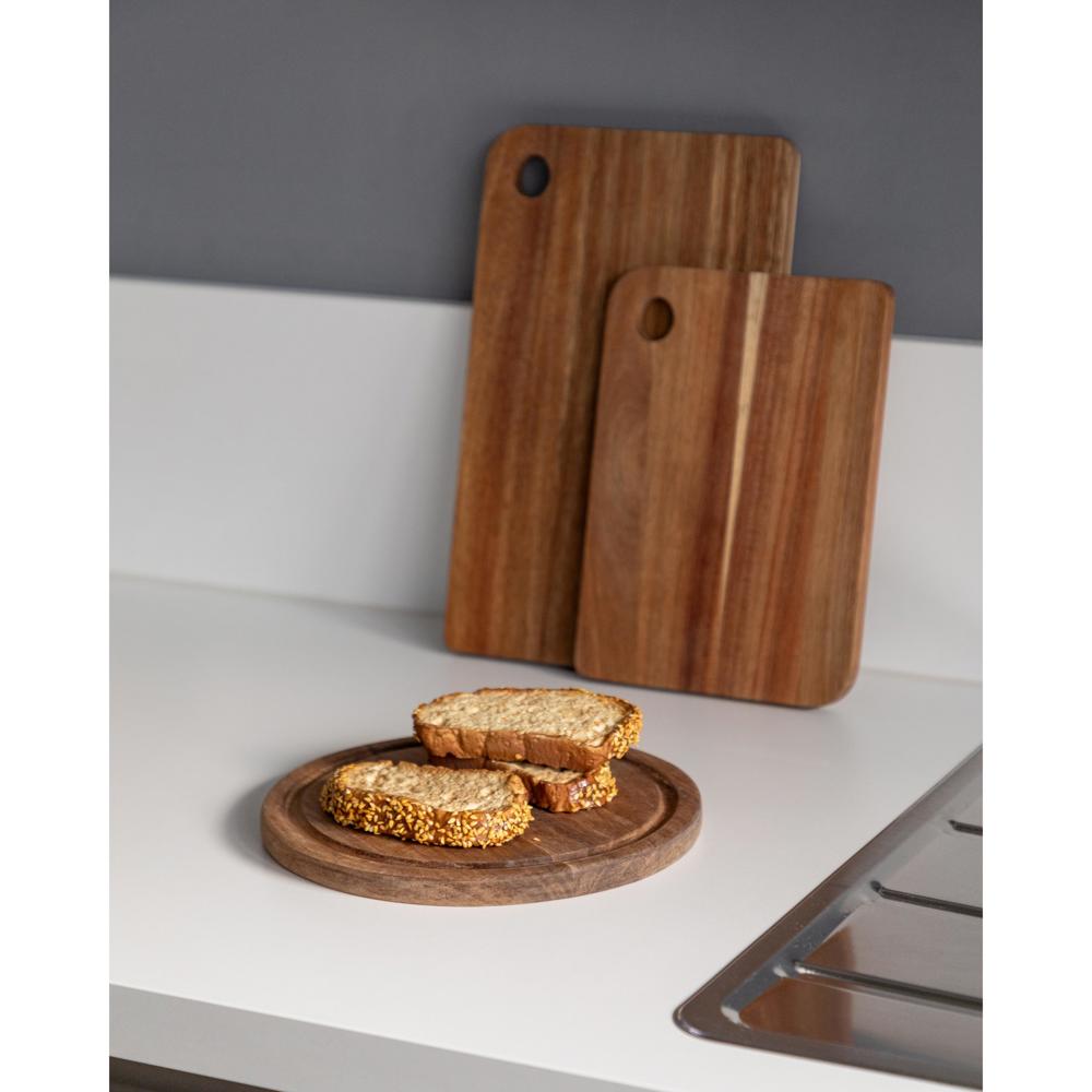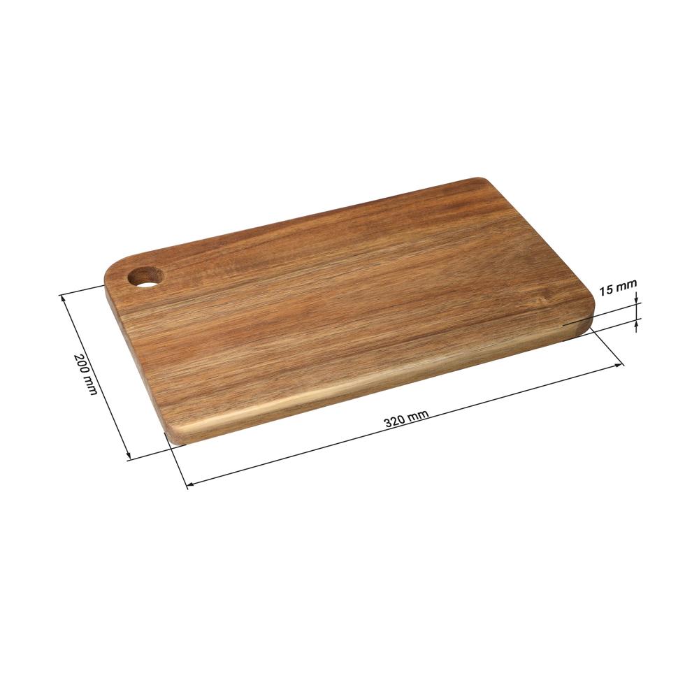 Das stilvolle Schneidbrett "Acacia" (32 x 20 cm, 15 mm dick) aus Akazienholz ist ideal für die Küche. Es ist mit Sojabohnenöl behandelt, das die natürliche Maserung hervorhebt. Ein Griffloch erleichtert die Nutzung und das Aufhängen. Für die Langlebigkeit wird Handwäsche empfohlen.