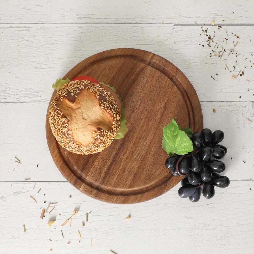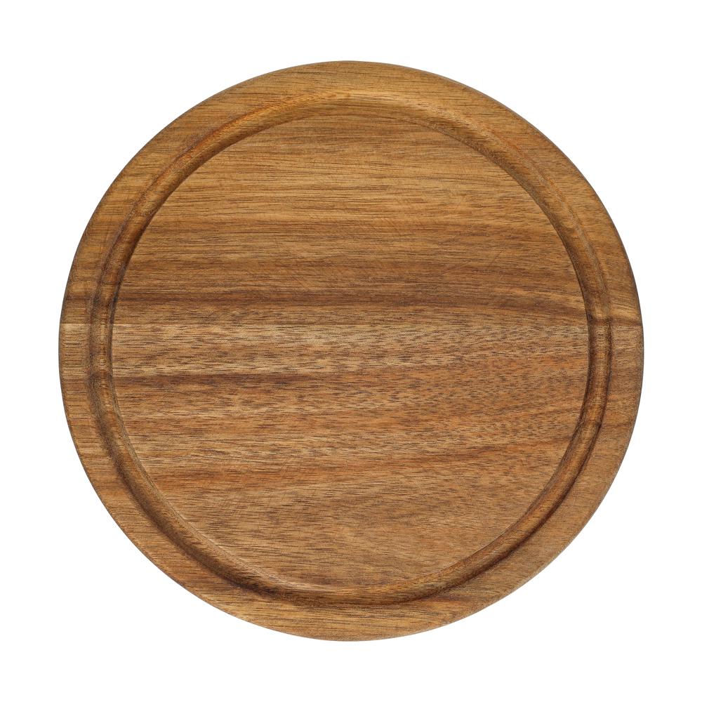 Das runde "Acacia" Schneidbrett (Ø 23 cm, 15 mm dick) aus Akazienholz verfügt über eine integrierte Saftrille. Seine Behandlung mit Sojabohnenöl schützt das Holz und erhält die Ästhetik. Ideal für tägliche Kücheneinsätze, empfiehlt sich die Handwäsche zur Pflege.