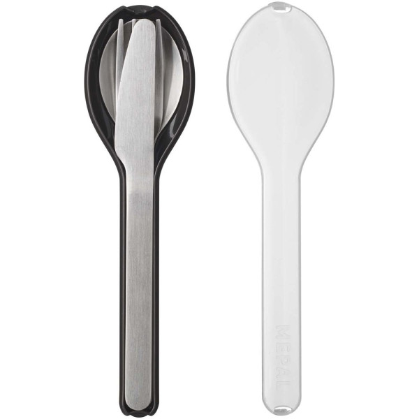 Diese stilvolle und praktische Ellipse Besteckset enthält ein Messer, eine Gabel und einen Löffel aus Edelstahl. Das Besteck wird in einem kompakten Kunststoffhalter aufbewahrt. Spülmaschinenfest.