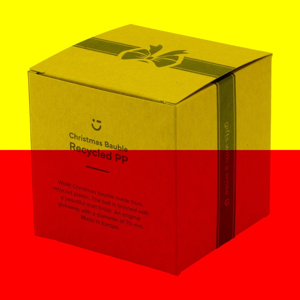 eihnachtskugel aus recyceltem Kunststoff. Die Kugel ist mit einer schönen matten Oberfläche versehen. Ein originelles Werbegeschenk mit einem Durchmesser von 70 mm. Hergestellt in Europa. Verpackt pro Stück.