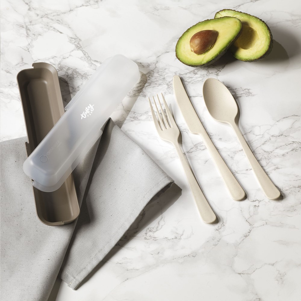 Kunststoff-Besteck der Marke Circulware. Das Set besteht aus einem Löffel, einer Gabel und einem gezackten Messer. Hervorragend geeignet zum Wandern, Campen oder für unterwegs. Leicht, praktisch und handlich. Spülmaschinengeeignet. Handwäsche wird empfohlen, um den Aufdruck zu erhalten. Mikrowellengeeignet. 100% recycelbar. Dieses Set trägt zu einer Kreislaufwirtschaft bei. Wird pro Set in einer stabilen, passenden Kassette geliefert. Niederländisches Design. Made in Holland.