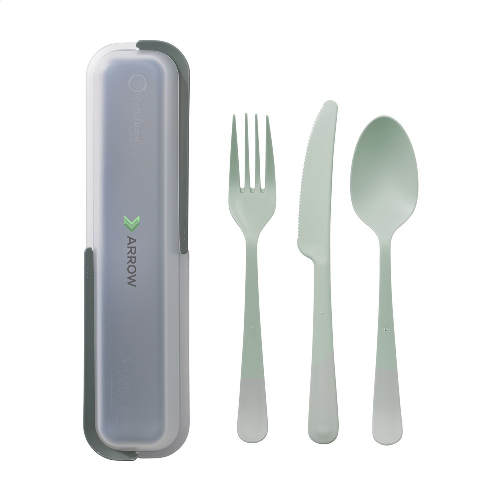 Kunststoff-Besteck der Marke Circulware. Das Set besteht aus einem Löffel, einer Gabel und einem gezackten Messer. Hervorragend geeignet zum Wandern, Campen oder für unterwegs. Leicht, praktisch und handlich. Spülmaschinengeeignet. Handwäsche wird empfohlen, um den Aufdruck zu erhalten. Mikrowellengeeignet. 100% recycelbar. Dieses Set trägt zu einer Kreislaufwirtschaft bei. Wird pro Set in einer stabilen, passenden Kassette geliefert. Niederländisches Design. Made in Holland.