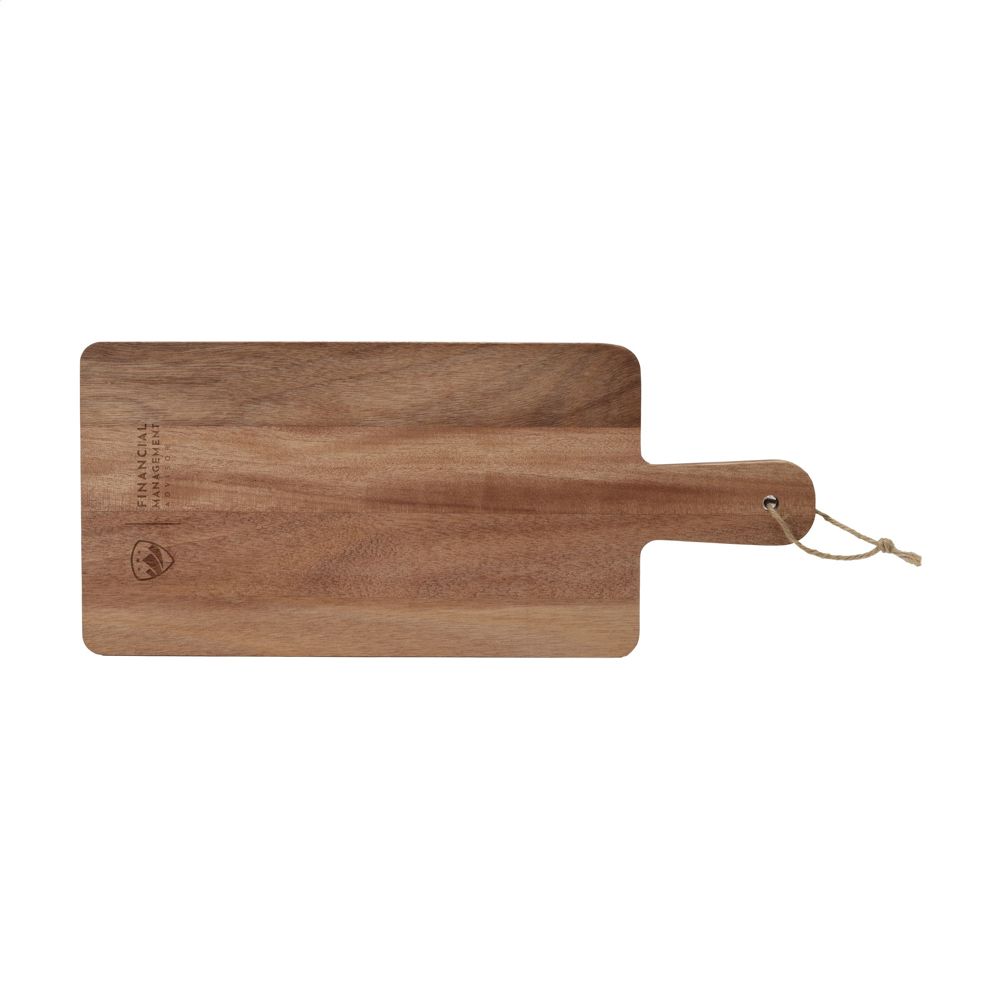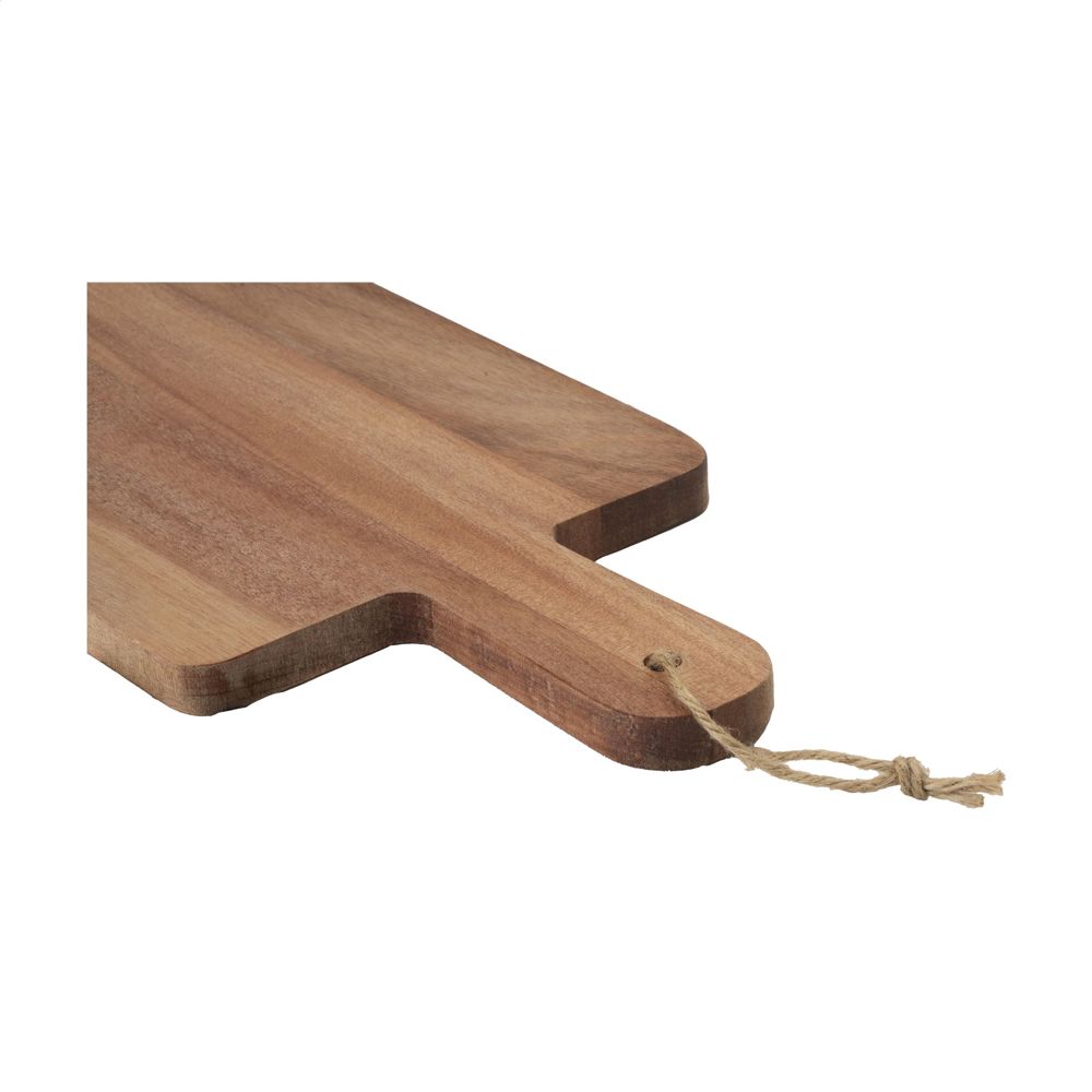 underschönes, großzügiges Woosh-Servierbrett aus FSC 100% zertifiziertem Akazienholz, einer robusten Holzart mit warmer Ausstrahlung. Die künstlerischen Eigenschaften von Akazienholz – wie die feine Maserung, die Flammenzeichnung und die unterschiedlichen Farbnuancen – verleihen diesem Servierbrett seinen einzigartigen Charakter. Dieses Brett wurde sorgfältig mit einem vegetarischen Sojabohnenöl behandelt. Dank der bakterientötenden Eigenschaften der Akazie ist dieses Brett von Natur aus hygienisch. Das Servierbrett ist nicht nur funktional, sondern auch ein dekoratives Prunkstück. Der praktische Aufhänger verleiht dem Brett zusätzlich Charakter. Das große Brett eignet sich perfekt, um Häppchen oder ein köstliches Mittagessen stilvoll zu präsentieren. Lassen Sie dieses wunderschöne Brett zu einem unverzichtbaren Bestandteil Ihrer kulinarischen Erlebnisse werden. Pro Stück in einer luxuriösen Wooosh-Geschenkbox.