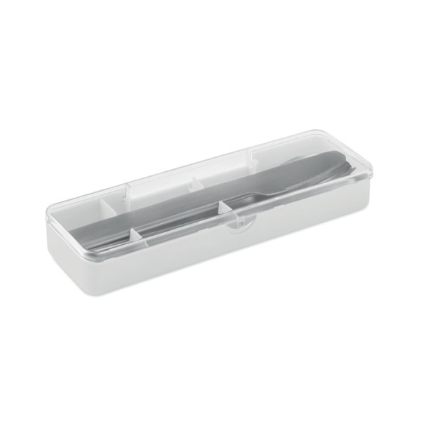 Besteck-Set aus Edelstahl im PP-Etui. Enthält Messer, Gabel und Löffel.