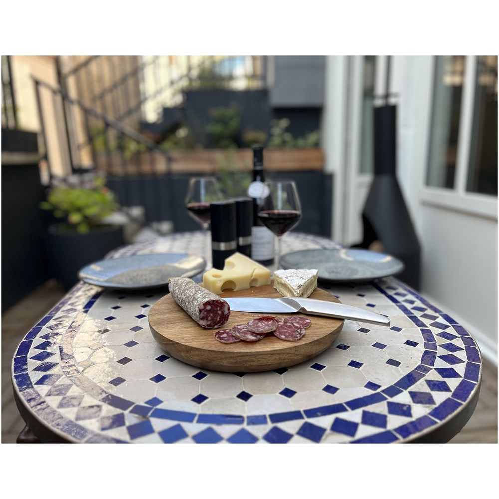 Exklusives Schneidebrett aus Akazienholz und Messerset aus Edelstahl. Dieses Produkt ist mit einer Gravur individualisierbar. Das Schneidebrett (30 cm Durchmesser und 4 cm Höhe) wurde mit einem Einsatz (30,4 × 4 × 2 cm) versehen, in dem das Messer nach Gebrauch aufbewahrt werden kann. Beide Produkte sind in einer Geschenkbox aus Recyceltem Papier (36,8 × 33,5 × 5,1 cm) mit Magnetverschluss verpackt. Inklusive 3 Jahre Garantie.