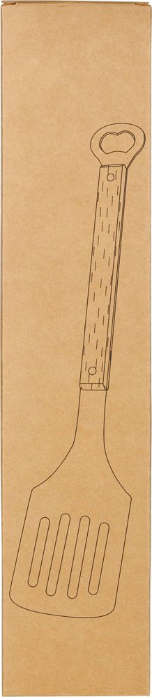 Der Grillspatel ist aus Edelstahl gefertigt und verfügt über einen Buchenholzgriff sowie einen integrierten Flaschenöffner. Er ist einzeln in einem braunen Karton verpackt.