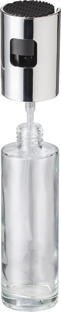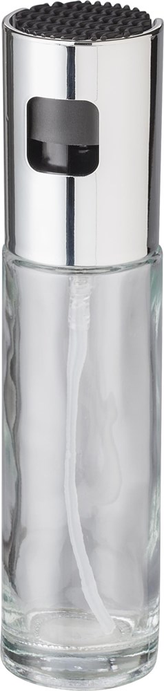 Ölspender aus Glas (100 ml). Mit Deckel aus chromatierter Kunststoff. Einzeln verpackt in einer braunen Papierbox.