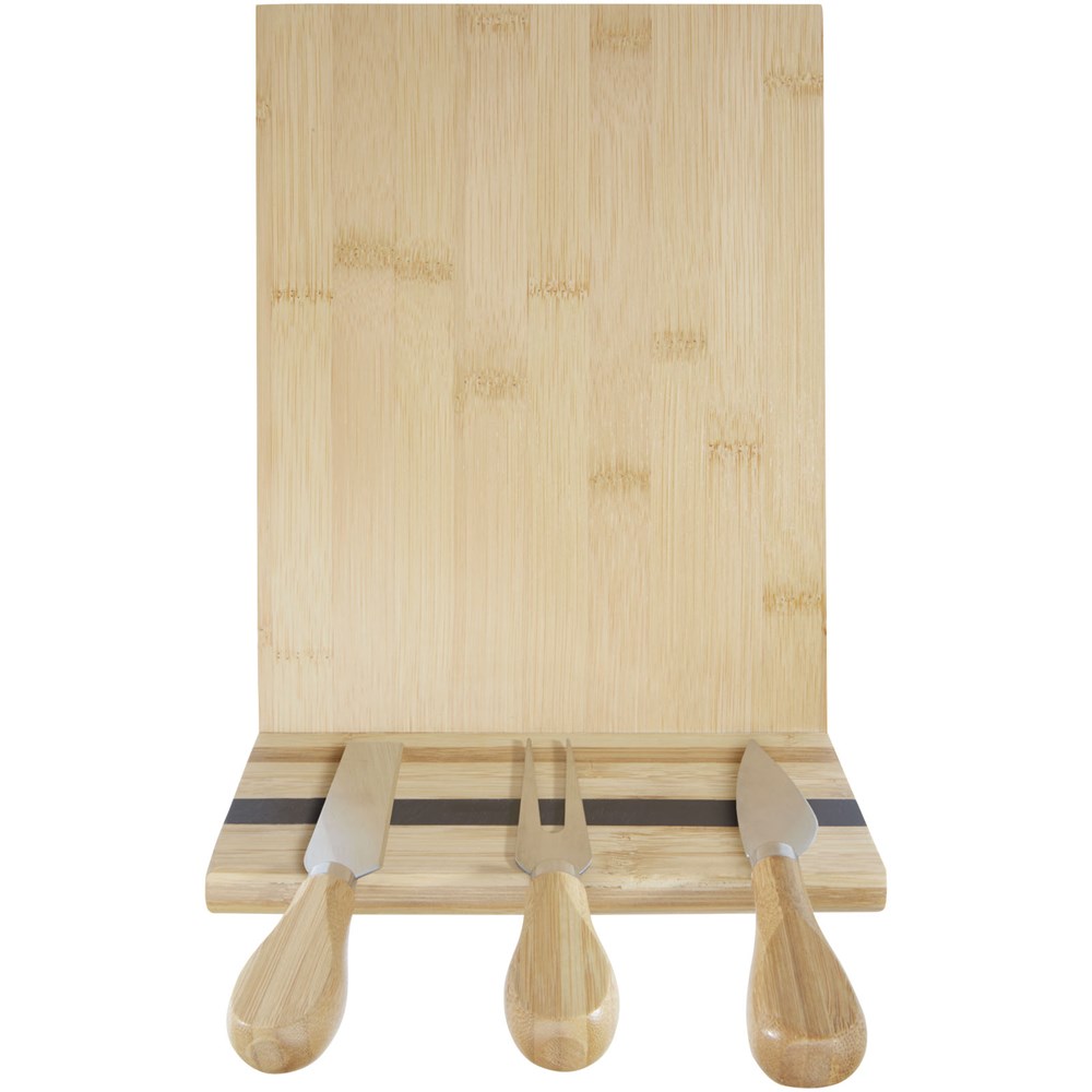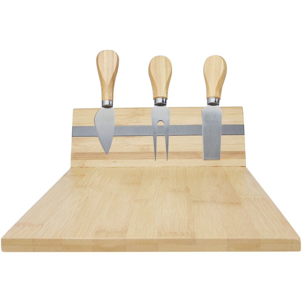 4-teiliges Käseset aus Bambus, bestehend aus einem Käsebrett (30 x 20,2 x 7,6 cm), 2 Käsemesser (12,5 x 2,5 cm und 12,5 x 2,7 cm) und einer Käsegabel (13,5 x 2,4 cm). An der Seite des Käsebretts befindet sich ein Magnetstreifen, an dem das Käsebesteck befestigt wird, so dass Sie den Käse stilvoll servieren können. Der verwendete Bambus wird nach nachhaltigen Normen beschafft und produziert.
