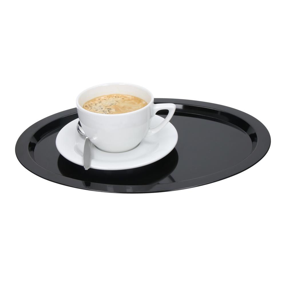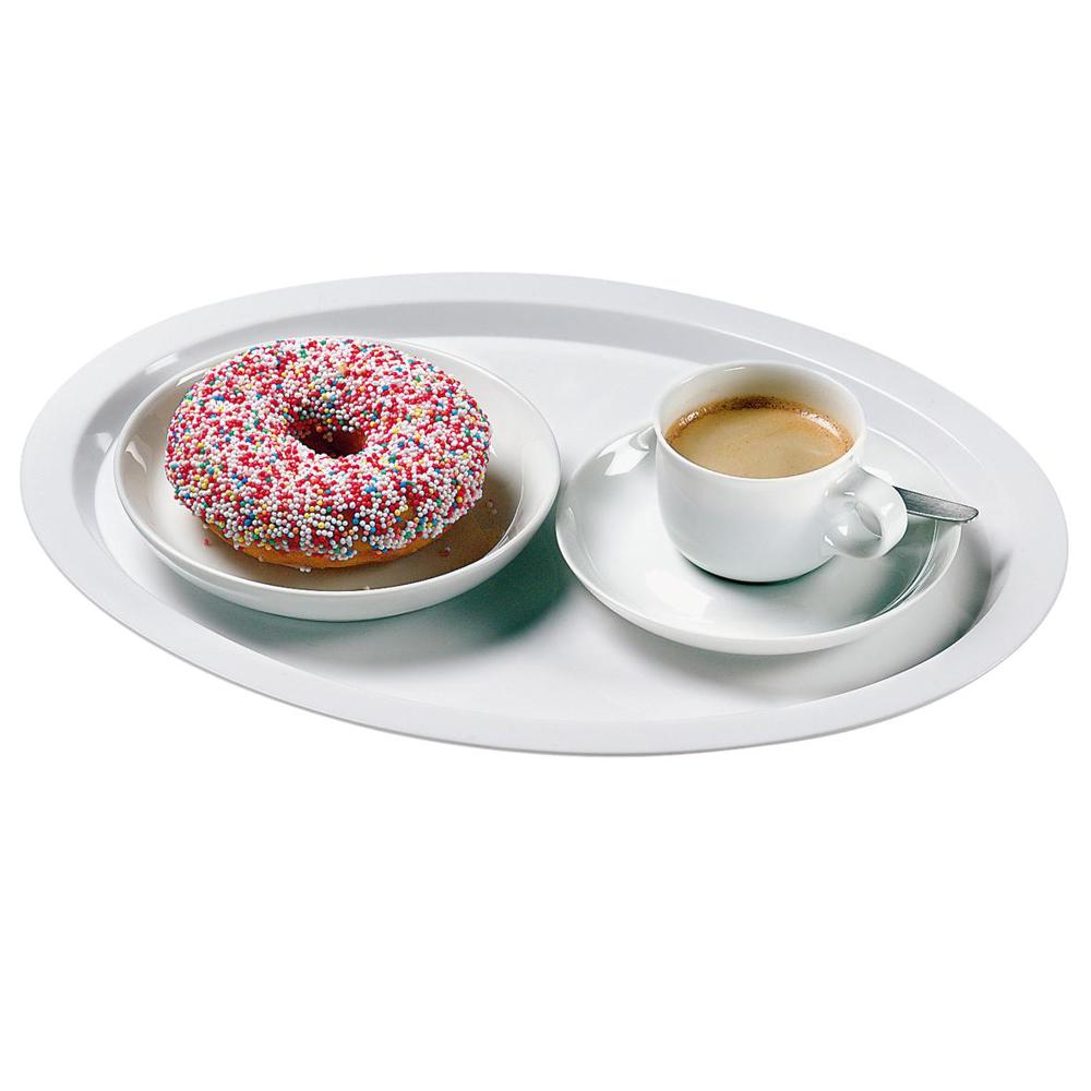 Ovales Tablett aus stabilem Kunststoff mit großer Werbefläche und niedrigem Rand zur besseren Handhabung. Besonders geeignet zum Servieren von Kaffee oder Tee.