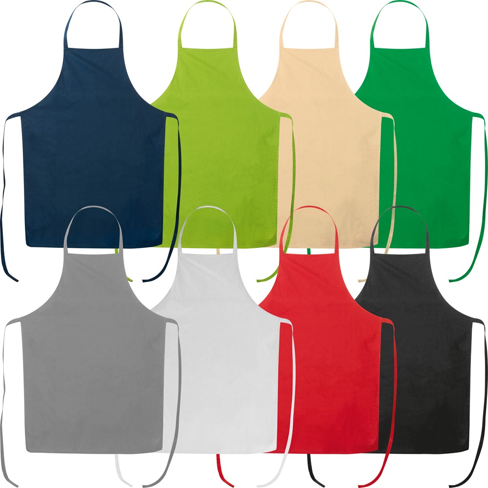 Oeko-Tex® STANDARD 100 zertifizierte Schürze aus Baumwolle (Grammatur 170g/m²) in verschiedenen Farben. Der Werbeaufdruck erfolgt direkt auf der Schürze.