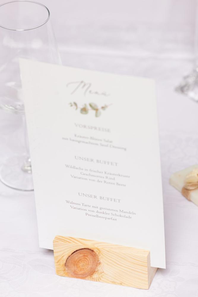 Der Hingucker auf jedem Tisch. Menükartenhalter aus naturbelassenem Kiefernholz mit zwei unterschiedlich Schlitzen zum Einstecken der Speisekarten. Inklusive 4 EVA-Füßchen am Boden.