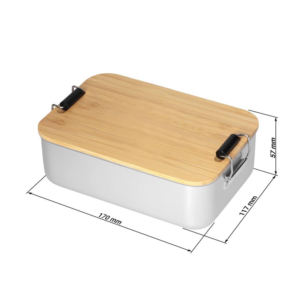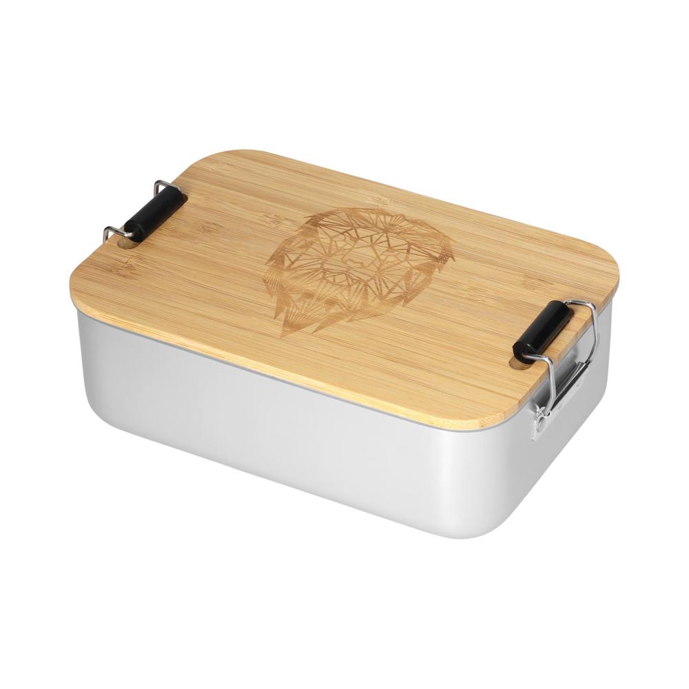 Plastikfreie Brotzeitbox für Ihre Promotion. Die Dose besteht aus Aluminium, der Deckel ist aus Bambusholz und verfügt über einen Silikonring und Klemmbügel für ein sicheres Verschließen. Der Deckel ist komplett abnehmbar und kann bei Bedarf auch als Schneidbrett verwendet werden.