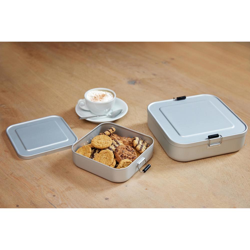 Kleine, quadartische Brotzeitbox aus Aluminium mit einer matten Oberfläche. Sicher verschließbar durch die beiden Klemmbügel. Der Deckel ist komplett abnehmbar. Nicht nur für den Einsatz auf der Baustelle geeignet.