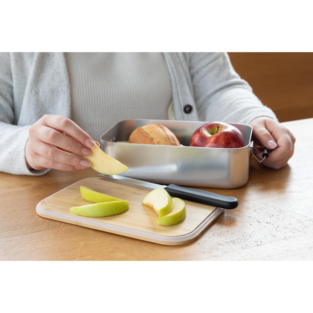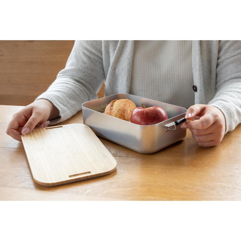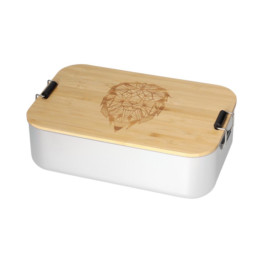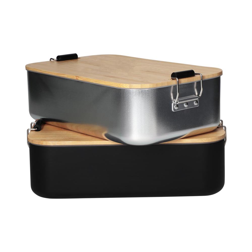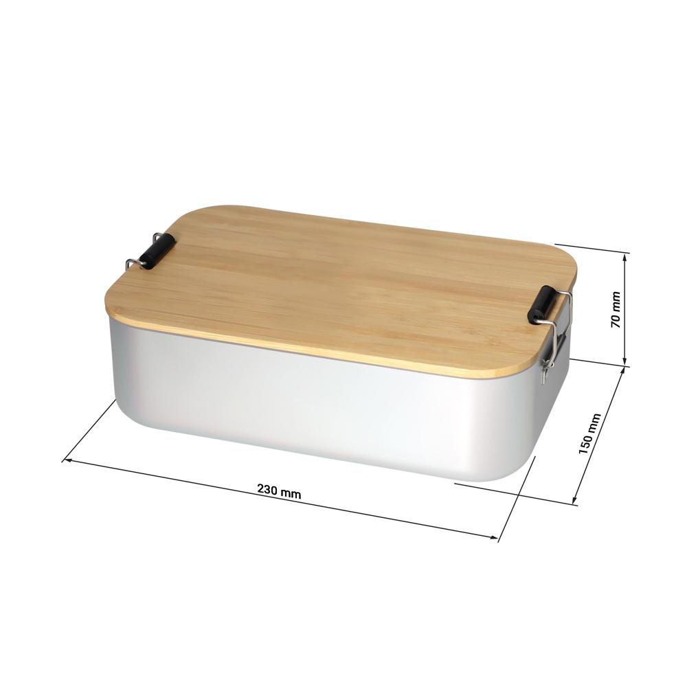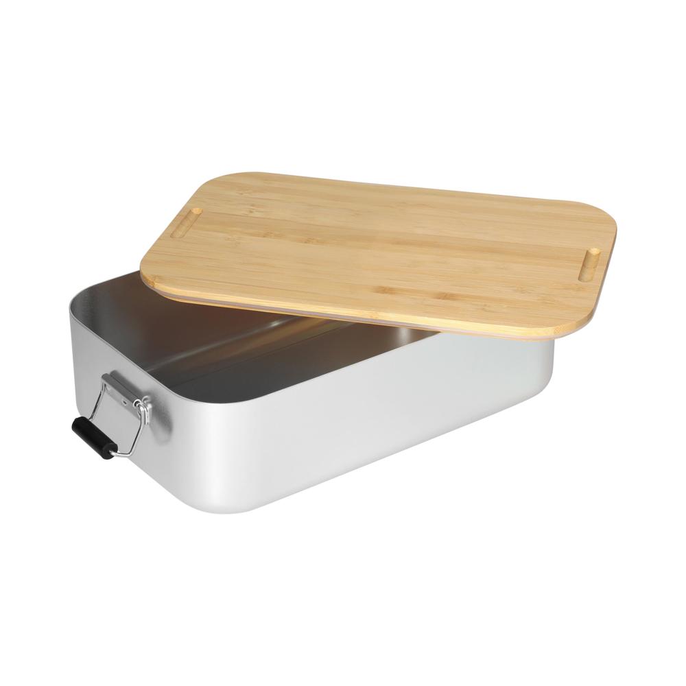 Große, plastikfreie Brotzeitbox für Ihre Promotion. Die Dose besteht aus Aluminium, der Deckel ist aus Bambusholz und verfügt über einen Silikonring und Klemmbügel für ein sicheres Verschließen. Der Deckel ist komplett abnehmbar und kann bei Bedarf auch als Schneidbrett verwendet werden.