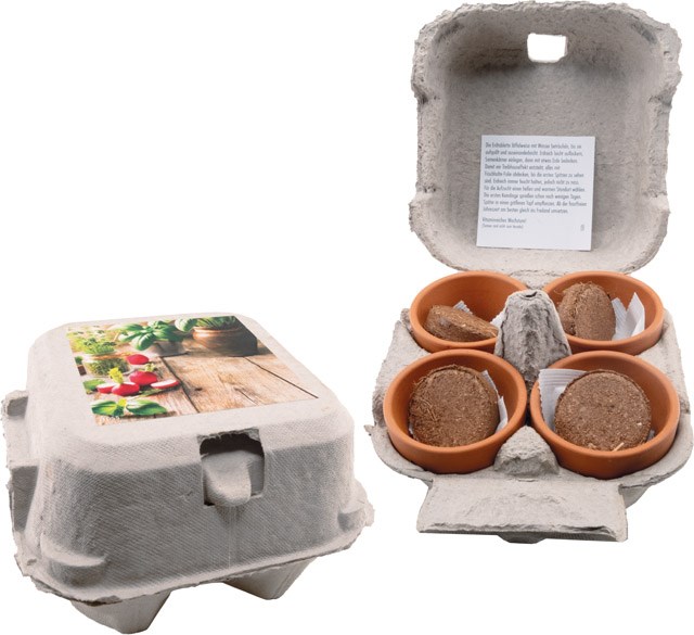 Bringen Sie Farbe und Vitamine auf den Teller. Unsere Samen lassen Kräuter und Gemüse wachsen, die sowohl Genuss für die Sinne versprechen, als auch Superfood für das Gehirn sind. Das Etikett im Standardmotiv bietet Platz für Ihre Werbebotschaft. Ebenso ist eine individuelle Gestaltung schon ab 250 Stück möglich. Inhalt: 4 Tontöpfchen Ø 4 cm, Erdtabletten, Samen: Basilikum, Kresse, Petersilie, Radieschen