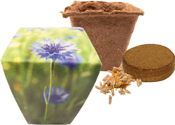 Das Naturtöpfchen ist ein ideales Anzuchtgefäß und kann später mit den heranwachsenden Blumen in die Erde gepflanzt werden, wo es sich dann komplett zersetzt. Schon ab 250 Stück kann die Banderole für Ihre Werbebotschaft oder mit einer eigenen Gestaltung verwendet werden. Inhalt: Erdtablette, Samen: Kornblume