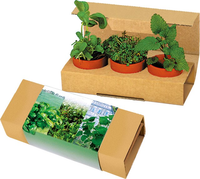 Der Naturkarton mit den kleinen Tontöpfchen macht Freude beim Überreichen. Aller gesunden Dinge sind drei. Mit den drei Tontöpfchen, Erdtabletten und Samen haben Sie ein richtiges Präsentpäckchen. Eine Anleitung zur Aussaat ist auf der Innenseite der Banderole aufgedruckt. Der Werbedruck erfolgt auf dem Standardmotiv der