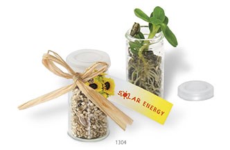 Ein Gewächshaus im Miniaturformat, das auch auf dem Schreibtisch oder auf der Fensterbank stehen kann. Im Gläschen ist bereits das Wachstumsgranulat mit den Samenkörnern enthalten. Auf der Anhängekarte ist die Anleitung bereits aufgedruckt. Auf der Vorderseite ist ausreichend Platz für Ihren Werbeeindruck. Auch eine eigene Gestaltung ist ab 250 Stück möglich. Inhalt: Wachstumsgranulat, Samen: Zwergsonnenblume