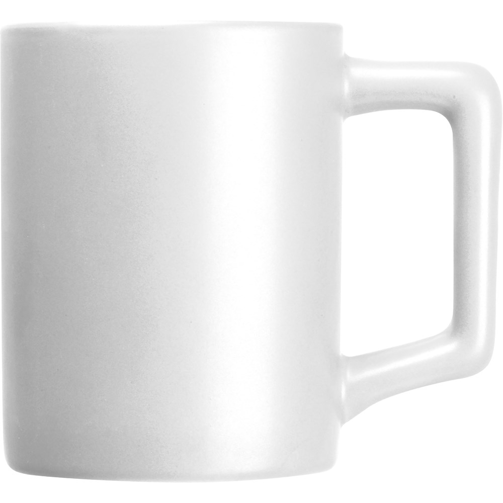 Keramiktasse mit eckigen Henkeln, matter Lackierung und einem Füllvermögen von 300ml. Wir drucken Ihre Werbung per Keramiktransfer auf die Tasse. Rundumdruck auf Anfrage möglich.