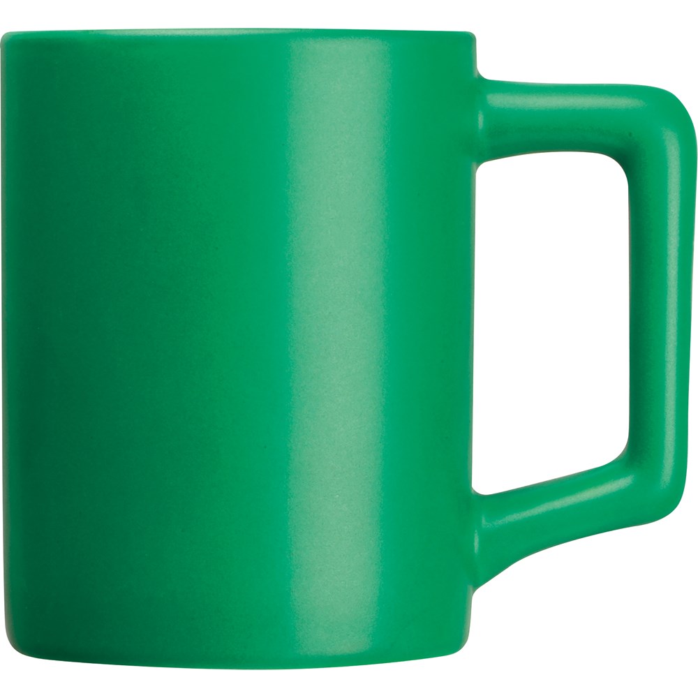 Keramiktasse mit eckigen Henkeln, matter Lackierung und einem Füllvermögen von 300ml. Wir drucken Ihre Werbung per Keramiktransfer auf die Tasse. Rundumdruck auf Anfrage möglich.