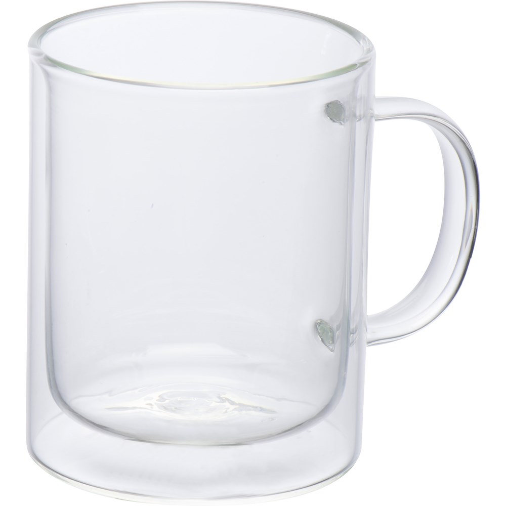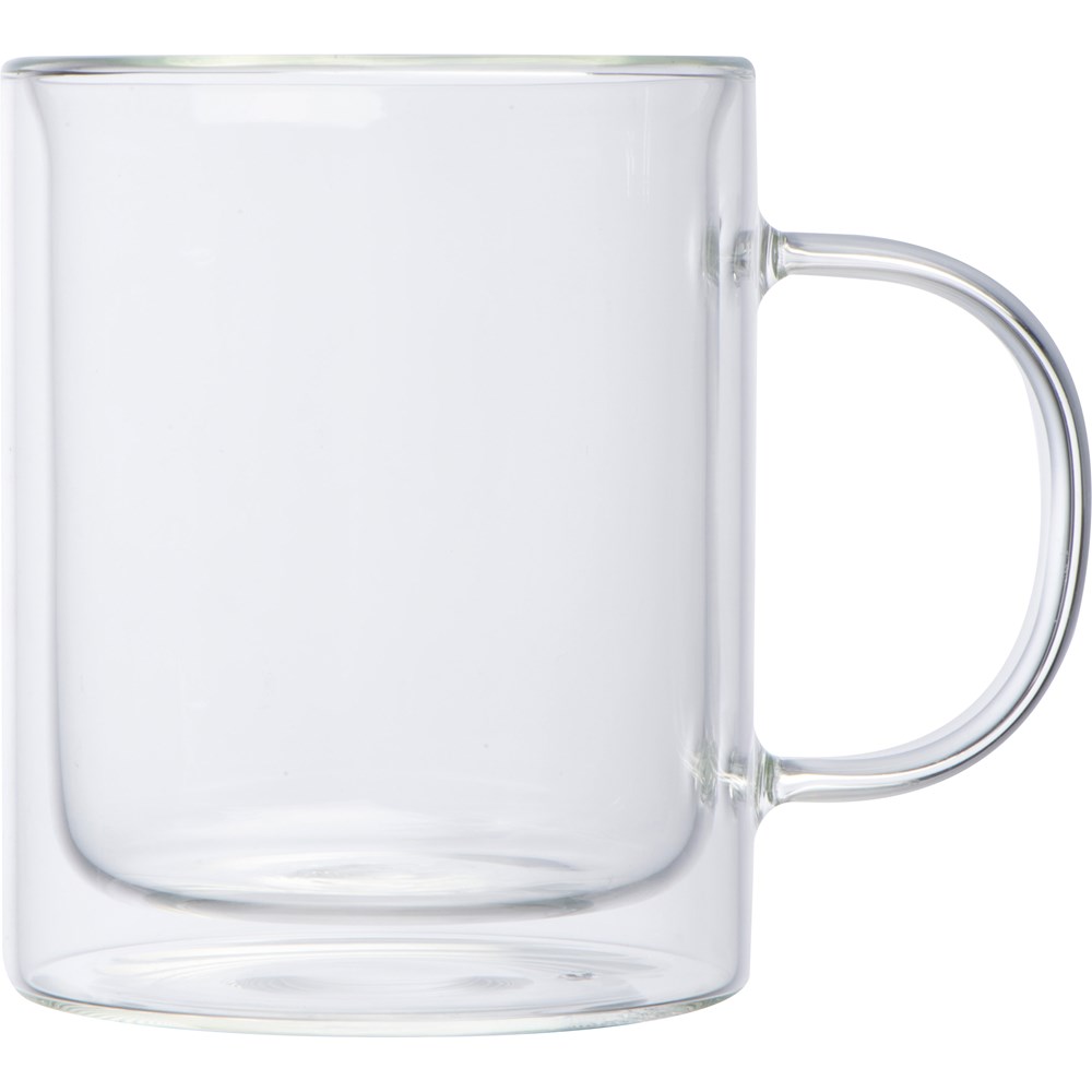 Doppelwandige Tasse aus Borosilikatglas mit einem Füllvermögen von 350ml. Wir drucken Ihre Werbung per Keramiktransfer auf die Tasse. Rundumdruck auf Anfrage möglich.