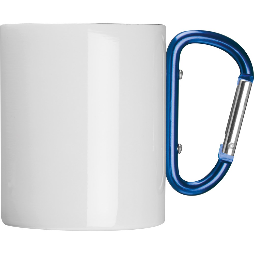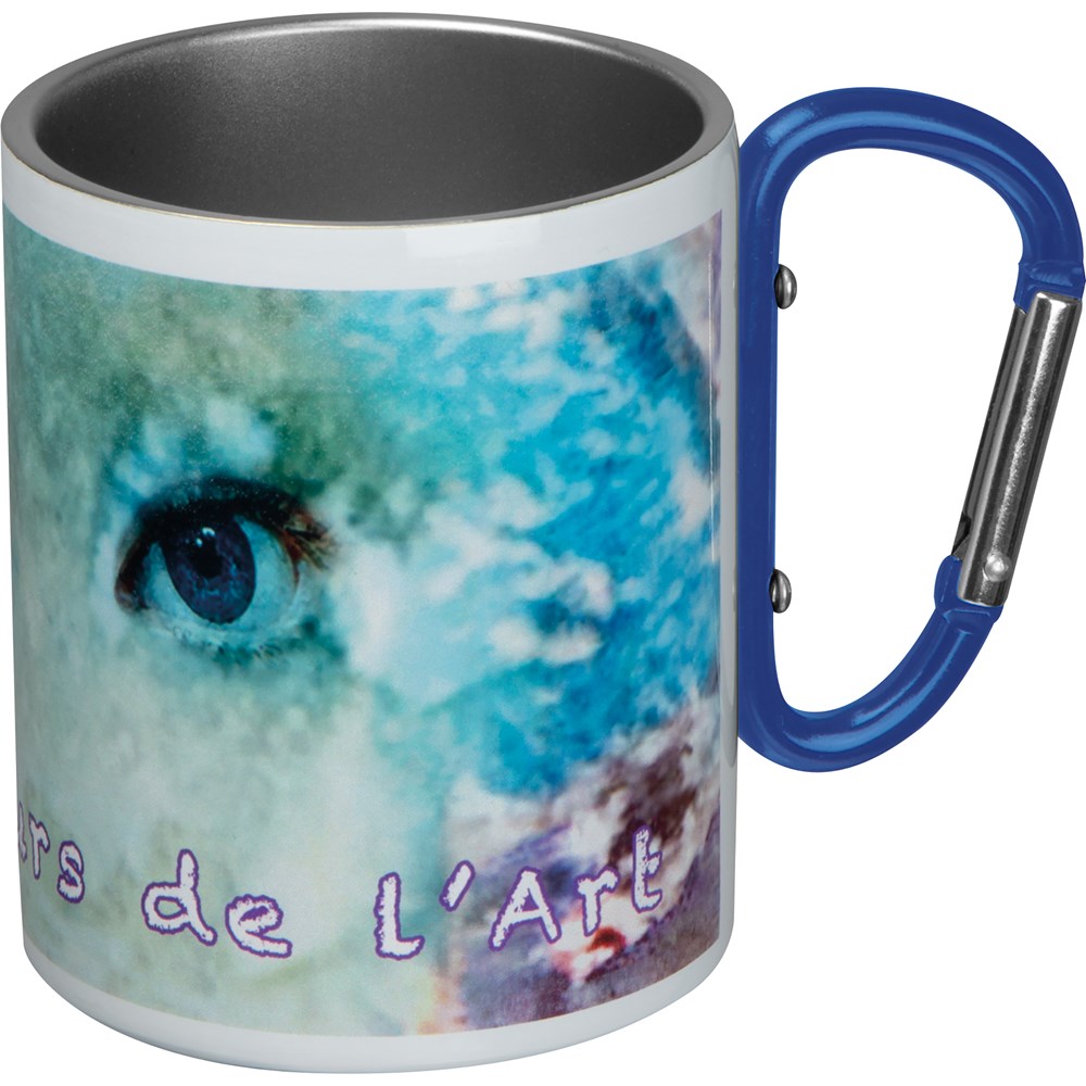 Trinkbecher aus Edelstahl mit farbigen Aluminium Karabinerhaken und einem Fassungsvermögen von 300ml. Ihre Werbung bringen wir mittels eines Sublimationsdrucks auf dem Becher an.
